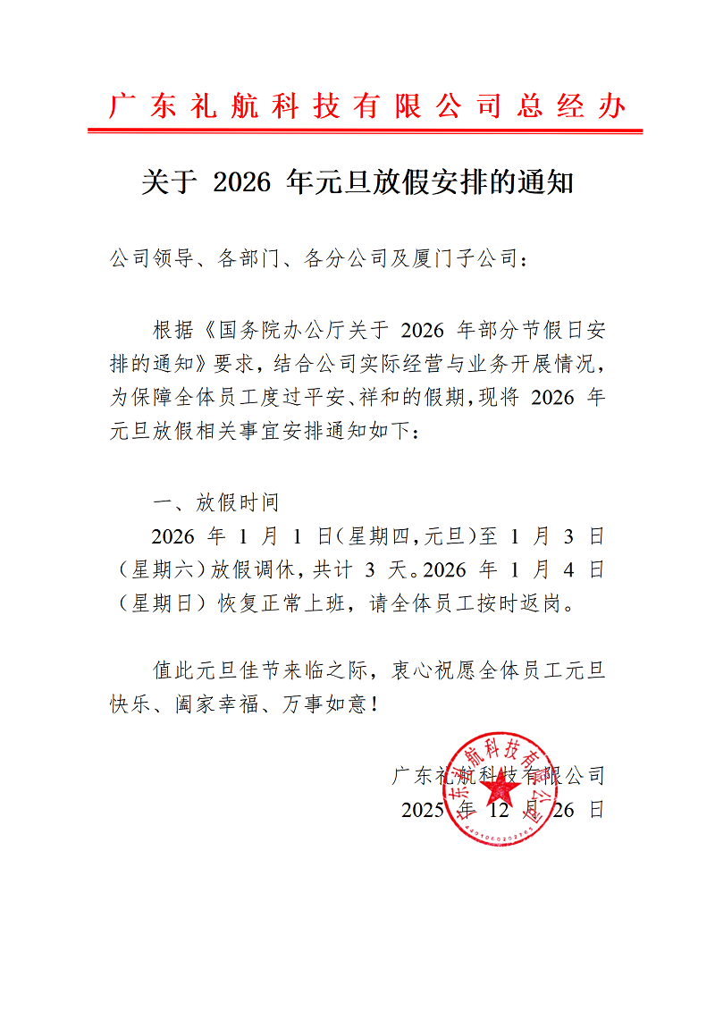 根据《国务院办公厅关于 2026 年部分节假日安排的通知》要求,结合公司实际经营与业务开展情况,为保障全体员工度过平安、祥和的假期,现将 2026 年元旦放假相关事宜安排通知如下:
